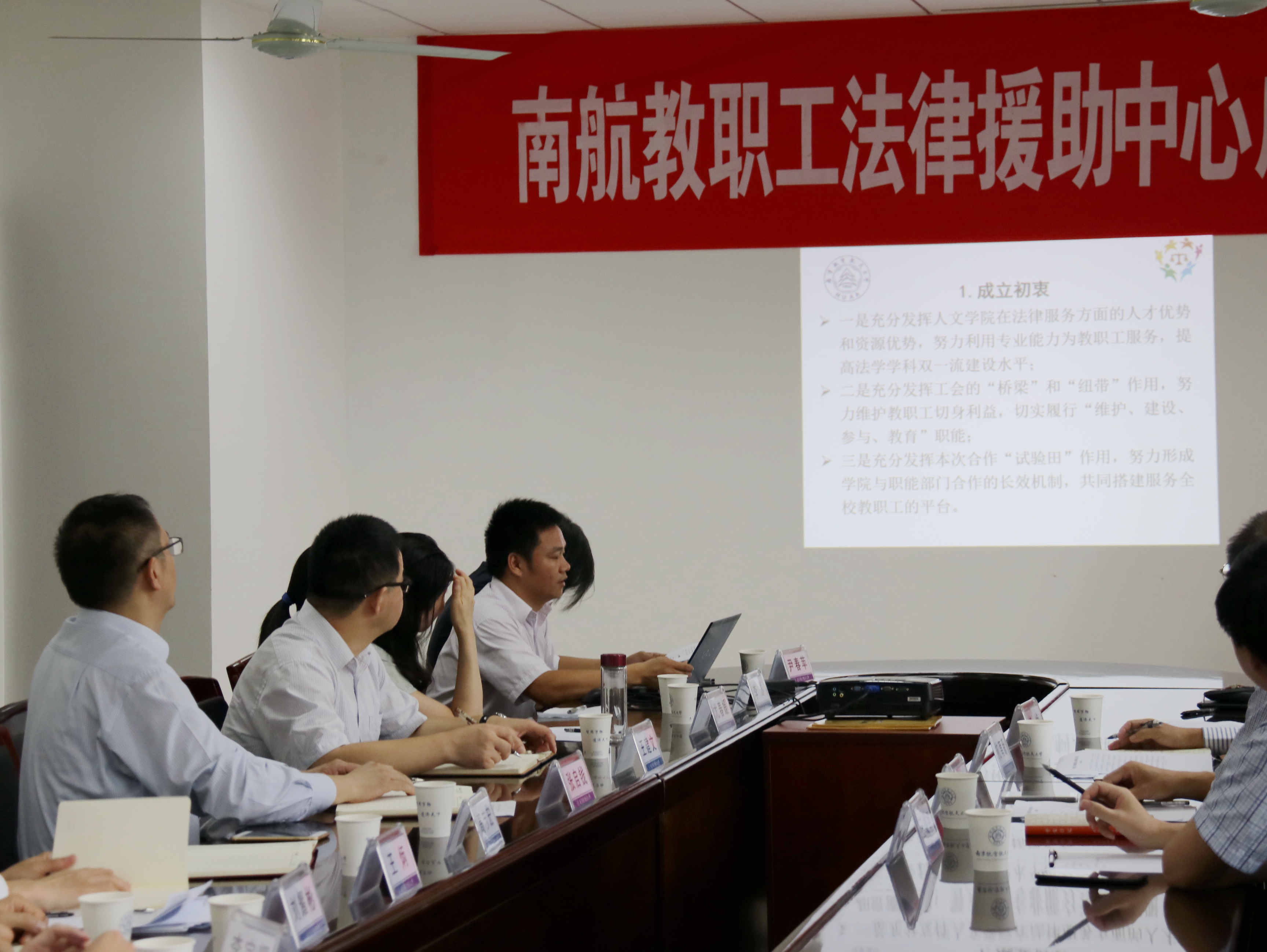南航教职工法律援助中心是由校工会和人文学院共同发起成立的公益性法律援助组织,2016年10月筹建试运行,主要服务对象为南航教职工(含在职及离退休教职工)及单位,受到教职工们的欢迎和赞誉。人文学院副院长、校法律援助中心主任高志宏对近一年的法律援助试运行情况做了介绍,法律援助中心日常管理工作,通过面对面、电话来访、网络在线、讲座沙龙等多种方式,开展面向教职工的公益性法律援助服务,帮助教职工提高法律意识,解决相关法律问题。提供法律咨询、法律文书代写、法案调解等全方位的法律服务;通过定期的普法宣传来提升教职工法律意识;针对经济困难或者遇到特殊案件的教职工提供核定、引荐法律援助。近一年的试运行,接待法律援助教职工及单位200余人次,为教职工排解各种法律问题,受到教职工的信赖和肯定。
