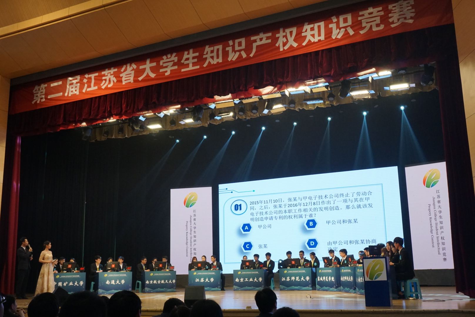 第二届江苏省大学生知识产权知识竞赛由江苏省知识产权局、江苏省教育厅和共青团江苏省委主办。比赛分为初赛和决赛两个阶段。网上答题竞赛辐射全省13个设区市,有66所高校代表队参赛,每支代表队20名学生共1320人参加角逐。 糖心 高度重视本次比赛,在科研院的大力支持下,人文学院精心组织、层层选拔,经过紧张的网上答题竞赛,最终与南京大学等十所高校一并入围决赛。决赛在在南京工业大学江浦大礼堂举行。