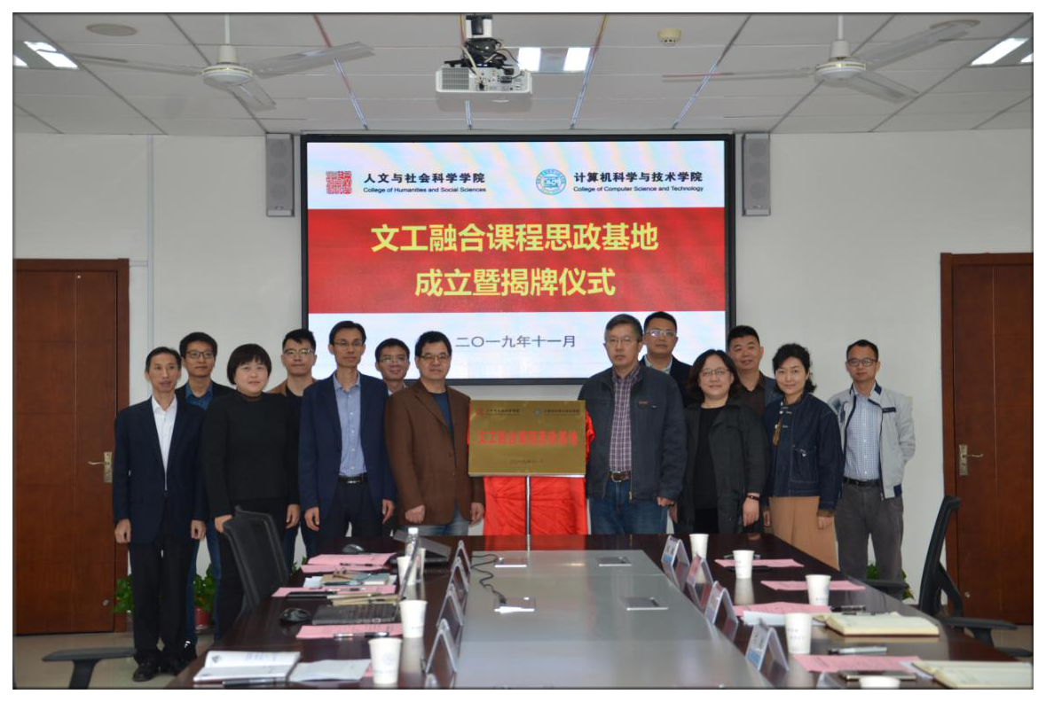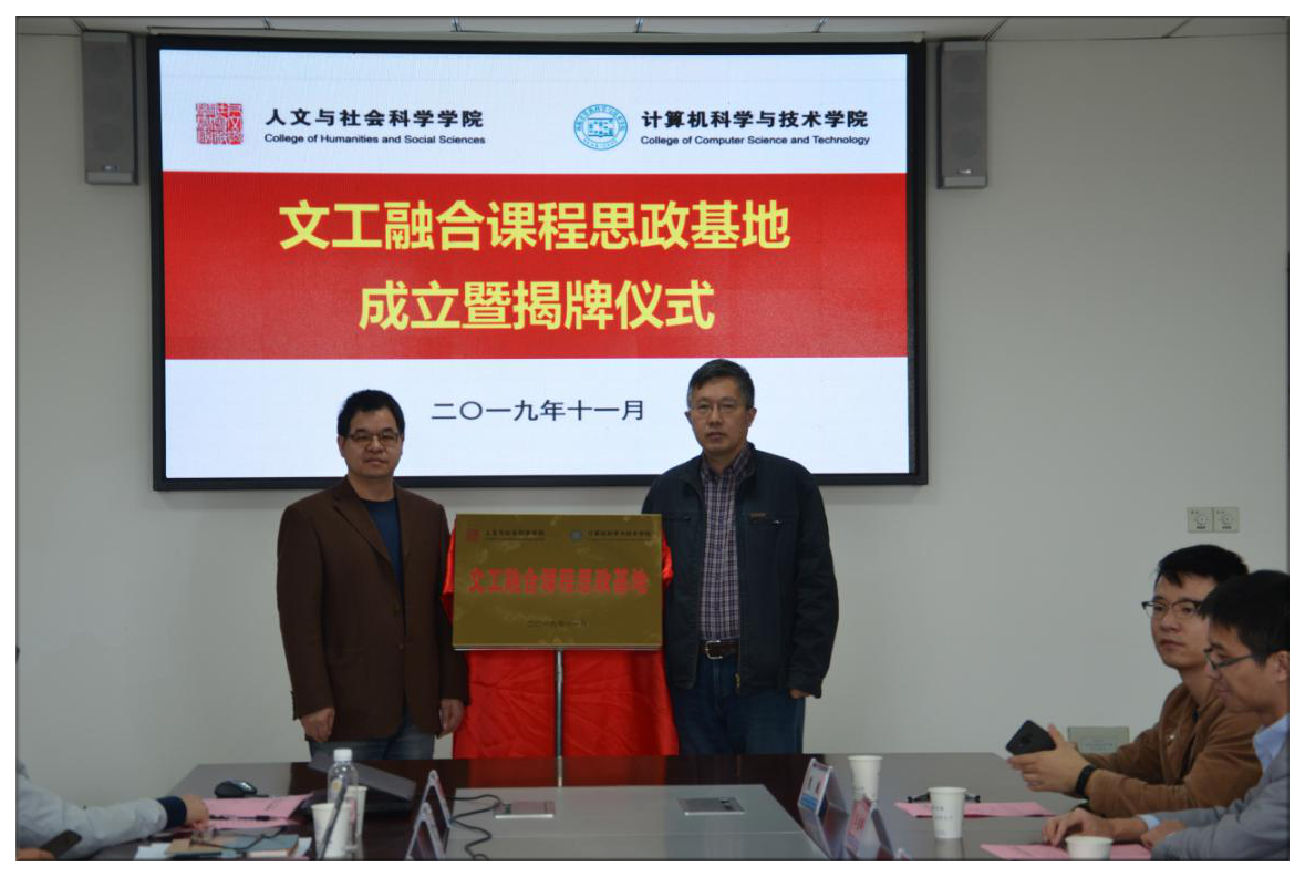 为了切实推进“不忘初心、牢记使命”主题教育扎实开展、取得成效,认真落实两学院理论中心组联合学习研讨成果,紧紧围绕立德树人根本任务,发挥专业优势,推进学科交叉融合、创新课程思政。11月7日,洪糖心 、计算机科学与技术学院/人工智能学院联合举行“文工融合课程思政基地”成立暨揭牌仪式。两学院领导班子成员、教师代表参加仪式。人文学院党委书记刘虎、计算机学院党委书记刘健荣共同主持仪式。