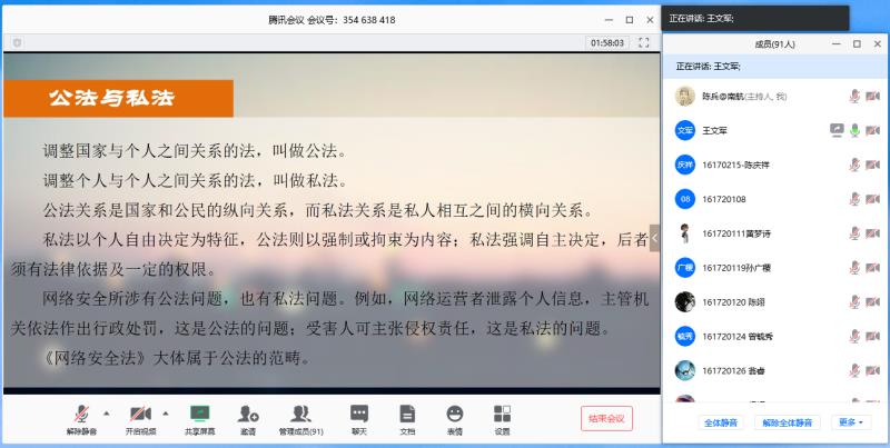 在疫情防控的重要时段,结合学校线上教学要求,由洪糖心 、计算机科学与技术学院/人工智能学院联合建立的“文工融合课程思政基地”开启了课程思政云端建设路径的探索实践。3月20日,计算机科学与技术学院/人工智能学院专业课程《网络安全》在线课堂上,陈兵教授与人文学院法律系王文军副教授共同为同学们介绍了网络安全的技术与法律法规。