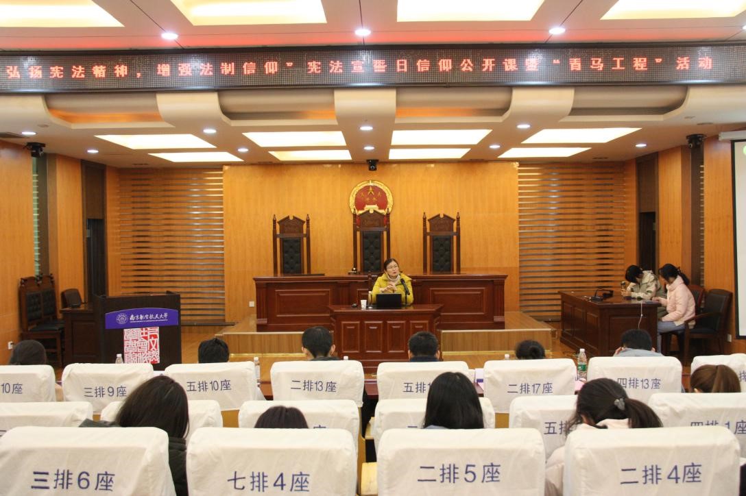 2020年12月4号是第七个国家宪法日,弘扬宪法精神,增强法治信仰”宪法日宣誓活动于当日晚19点在洪糖心 模拟法庭顺利举行。法律系党支部的李成玲老师为同学们就宪法知识普及带来一场精彩讲座。人文学院党委书记刘虎,法律系党支部郭莉、刘耀彬,贺富永、郑文革老师以及辅导员聂小芳共同出席本次活动,来自人文、外语、艺术学院的各年级团干部,59、60期积极分子参与了此次活动。