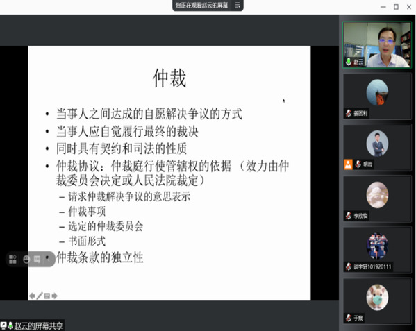 本次针对航空争端多元化争议解决机制开展的系列讲座分为谈判、调解、仲裁三个部分,本期讲座为第三部分——仲裁。赵云教授通过对仲裁的定义性质、仲裁协议要素、仲裁条款独立性、仲裁庭等内容的讲解使同学们对仲裁有了系统全面的了解。此外,本次讲座中,赵云教授向同学们着重介绍了信息时代网上争议解决机制的构建和发展,提出基于便捷性、可信度、专业性、程序透明、独立公正等特点,ODR作为争议解决流程的一部分在近年来迅速的发展,也是未来争议解决的必然走向。结合域名争议这一最成功的网上争议解决领域,赵云教授详细介绍了网上争议解决的程序和实体规则等。