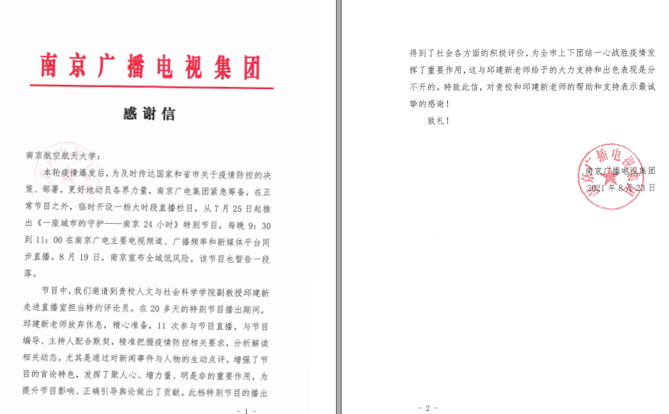 南京疫情爆发以来,人文学院师生积极配合学校及上级部门做好疫情防控相关工作,同时充分发挥专业优势,参与省市相关部门疫情防控舆论宣传、法律宣传及志愿服务等工作,为战胜疫情发挥了重要的作用。近日,南京广播电视集团向 糖心 发来感谢信,对 糖心 人文学院邱建新老师在抗疫工作中的帮助和支持表示了诚挚的感谢。