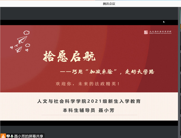 经过高考的洗礼,广大学子抱着对“象牙塔”的憧憬与渴望,来到这期盼已久而又陌生的环境。如何让这些刚入学的大一新生尽快适应大学的学习生活,是我们高校辅导员所面临的问题,也是辅导员工作是否能够顺利开展下去的基础。10月7日晚,人文学院召开了“拾愿启航——巧用’加减乘除’走好大学路”公开月讲评,辅导员聂小芳主讲,2021级全体本科生线上参加。