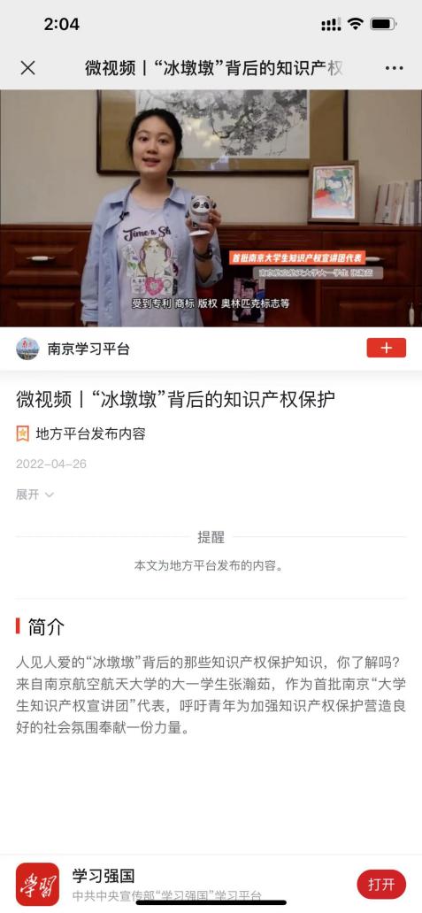 张瀚茹主讲的两个微视频“‘冰墩墩’背后的知识产权”和“保护知识产权 做强中国品牌”在“学习强国”平台发布,获得广泛好评。