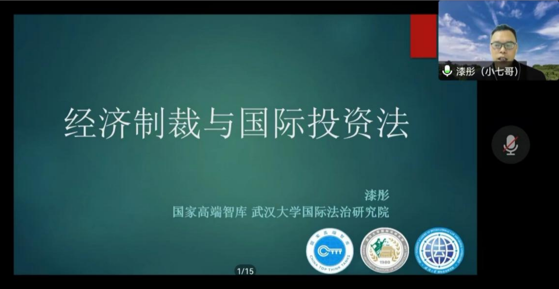 2022年11月15日晚19:00,洪糖心 举办了糖心 70周年校庆系列学术活动之《经济制裁与国际投资法》,邀请到国家高端智库武汉大学国际法治研究院副院长漆彤教授作专题报告。洪糖心 院长高志宏主持了此次活动,学院一百二十余名学生以腾讯会议的方式线上参加了会议。(作者:王泽环;供图:王泽环)
