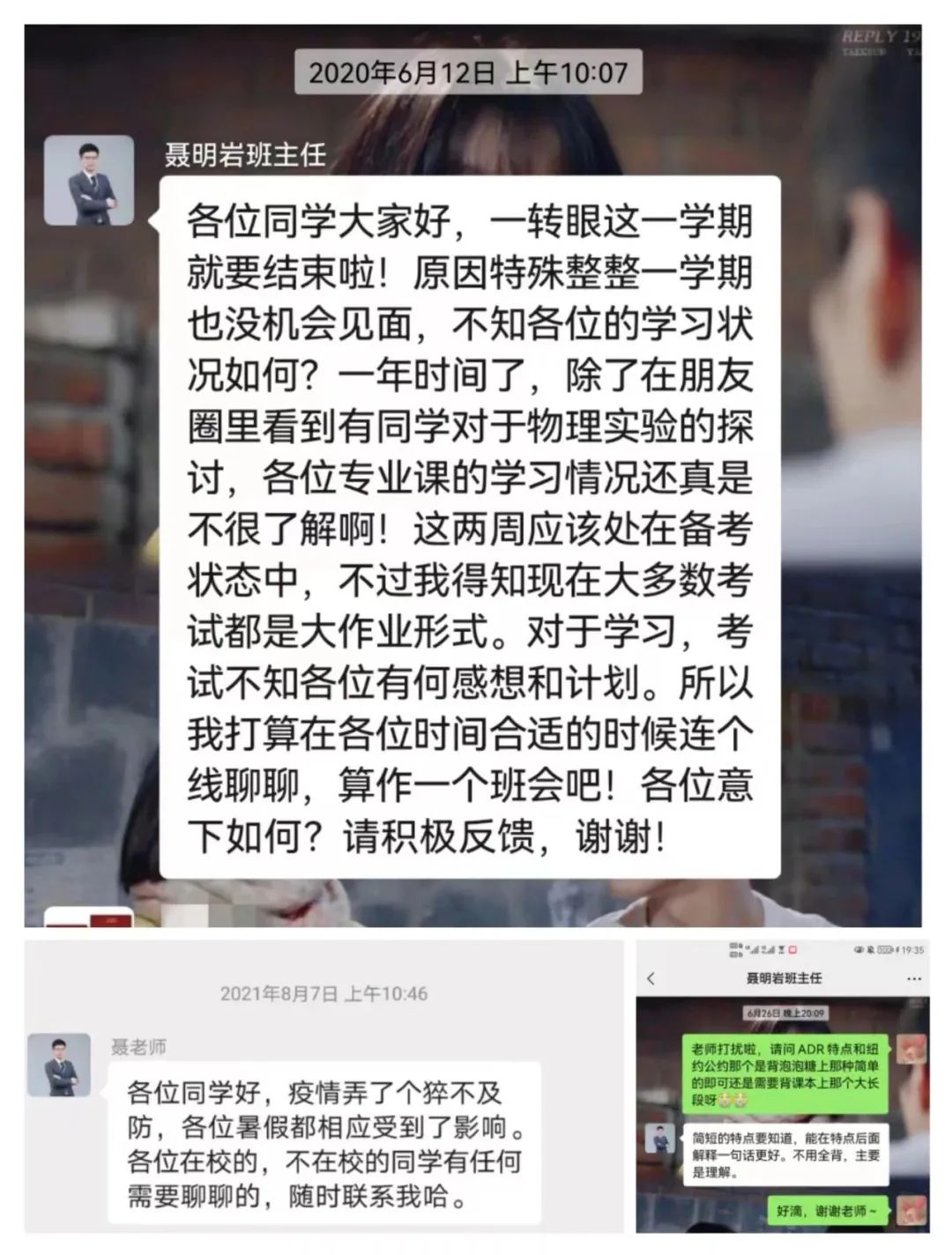 “我与我的班主任第一次见面是在线上,那时特别好奇大学班主任是做什么的,懵懂中加了班主任聂明岩老师的微信。”小L同学说。