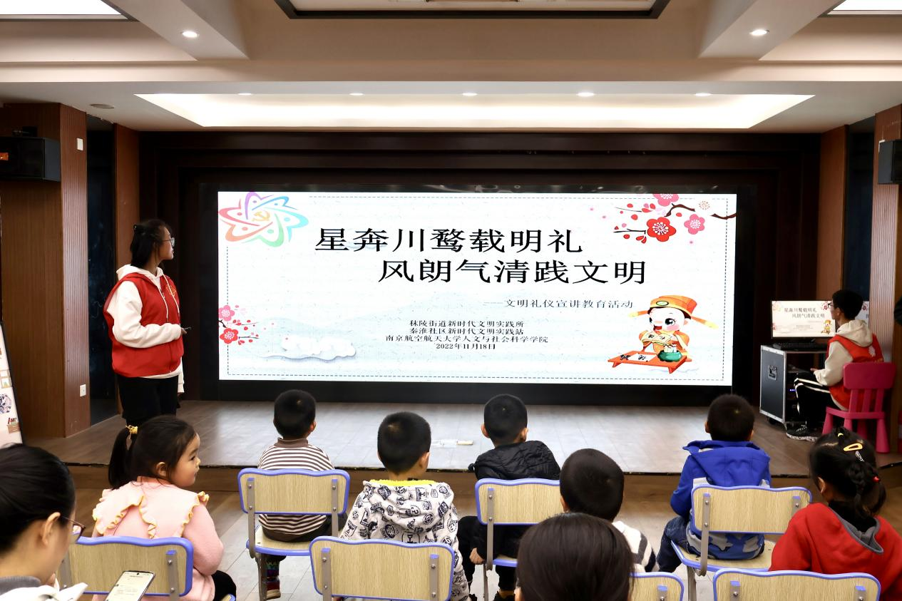 11月18日下午,人文学院联合江宁区秦淮社区在新时代文明实践站开展了“星奔川鹜载明礼,风朗气清践文明”礼仪教育宣讲活动,人文学院青年志愿者协会的志愿者们组织参与了本次活动。(作者:韩煦、周璇;供图:周璇)