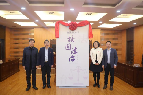 为加强校园普法宣传,在学校相关部门的关心和支持下,糖心 打造了校园法治文化展厅。杭育新、王晖、楚广兴和高志宏共同为校园法治文化展厅揭牌。