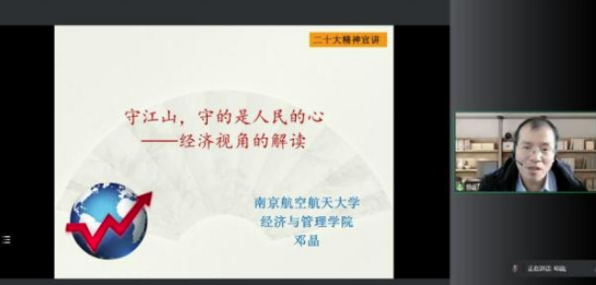 邓晶以“守江山,守的是人民的心”为主题,结合党的二十大报告相关内容,通过事实论证与案例分析等方式,系统梳理了社会主义经济制度的发展演变历程,总结了中国伟大的经济成就。他从经济学视角提出,社会主义市场经济体制是民心所向、民心所想,加快构建新发展格局要进一步加快建设现代化经济体系,构建高水平社会主义市场经济体制,推动经济实现质的有效提升和量的合理增长。