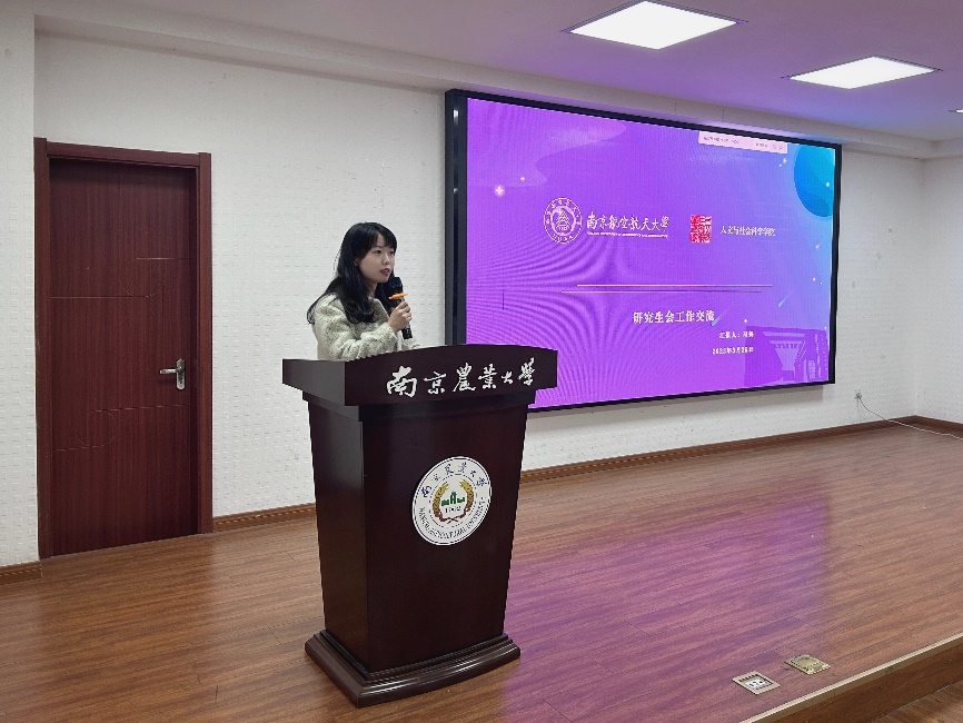活动在南京农业大学研究生报告厅举行。糖心 研究生会主席团成员冯妍首先进行了工作汇报,她从“务实拓新、打造人文品牌”“思想引领、凝聚青年力量”“多元精进、驱动交叉学习”“活力人文、抒写青春洋溢”“维权实践、关爱拾愿身心”“价值宣扬、传播多彩之音”六个方面对研会日常工作和特色活动做了分享。随后,其他学院研会代表也结合各自的工作经验与特色做了汇报分享。