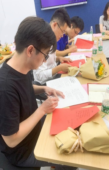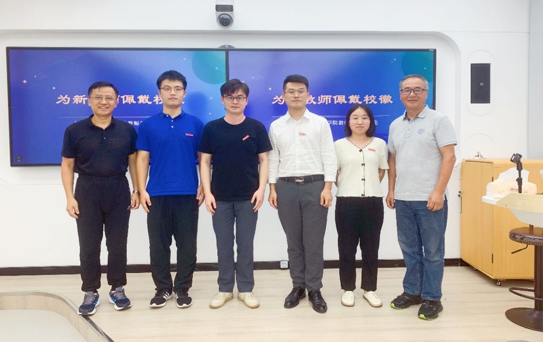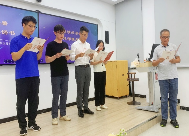 在“师德赓续 薪火相传”环节,两位荣休教师为新入职教师佩戴校徽,带领他们一起宣读了师德师风承诺书。学院教学督导组成员为四位新教师寄语,表达了对年轻教师的关怀和期许,希望他们坚守自己的教育初心,牢记立德树人使命,脚踏实地做好本职工作,积极为学校和学院发展贡献自己的力量。随后,四位新教师讲述了自己的“人文初体验”和今后的工作规划,表示一定会传承学院优良教风师风,接好前辈们手中的“接力棒”,努力做好“经师”和“人师”。