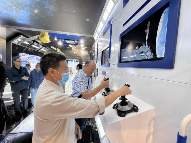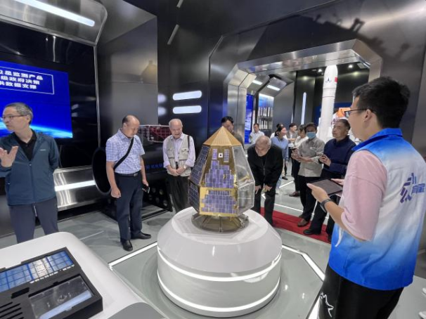 秦淮区老科协相关领导、瑞金路街道社区工作站成员一行,首先参观了学校航天教育教学基地与“御风园”,实地了解中国航天发展历程,近距离、全方位、沉浸式感受国防文化,真切感悟“两弹一星”精神、载人航天精神、探月精神。