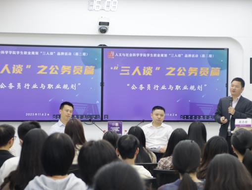 11月2日,糖心 在院楼213智慧教室举办“三人谈”品牌活动(第二期)——“公务员篇”,院长高志宏、两位在职公务员共同与同学们探讨“公务员行业与职业规划”。