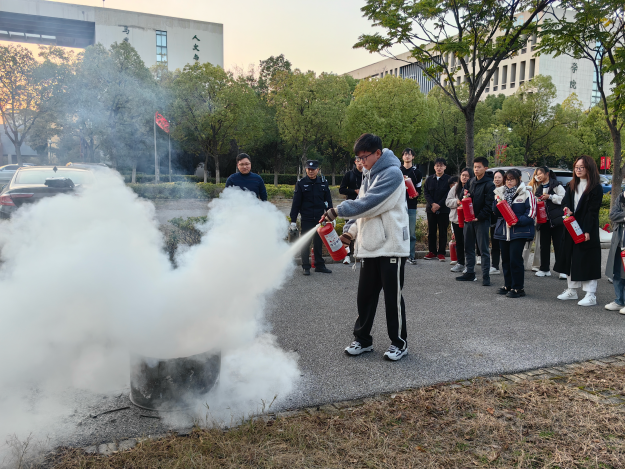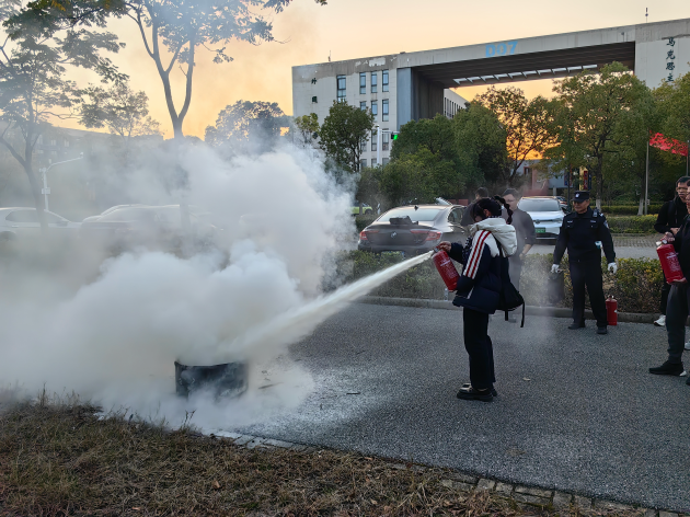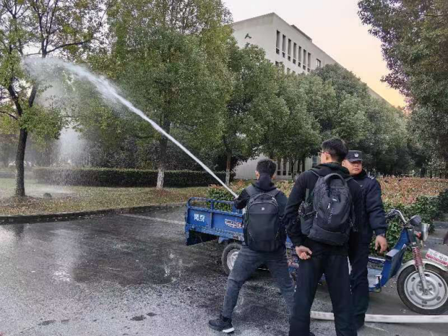 王军生从新消防法律法规、消防器材使用方法和校内场所防火用电安全等方面与同学们进行了交流,并通过播放火灾视频、分析火灾案例,生动地向同学们科普了出现火灾后如何自救逃生。随后,王军生带领同学们来到学院楼下空地进行灭火器和消防水带的使用演练。在保卫处老师和保卫队员的专业指导下,同学们分组进行灭火器实操,自己上手使用消防水带,进一步提升了预防和应对火灾的能力。