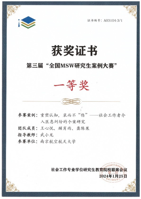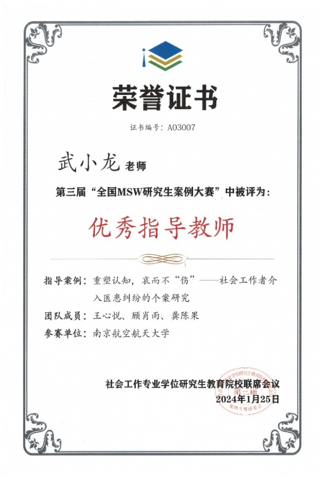 经过三个月的精心准备和深入讨论,反复修改案例申报书和答辩发言稿,糖心 MSW研究生组队申报的《重塑认知,哀而不“伤”——社会工作者介入医患纠纷的个案研究》成功晋级决赛,并通过精彩的现场答辩荣获一等奖。武小龙老师获“优秀指导教师”荣誉称号。