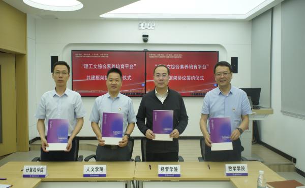 学习交流结束后,高志宏与数学学院院长王春武、经管学院党委书记苏州、计算机学院副院长(主持工作)黄圣君分别代表四个学院签订了“理工文综合素养培养平台”共建框架协议,并就共建理工文党建“一融双高”赋能提质平台、“四有”好老师队伍、“三融”课程思政体系、复合创新拔尖人才培养体系、跨学科交叉研学平台达成共识。