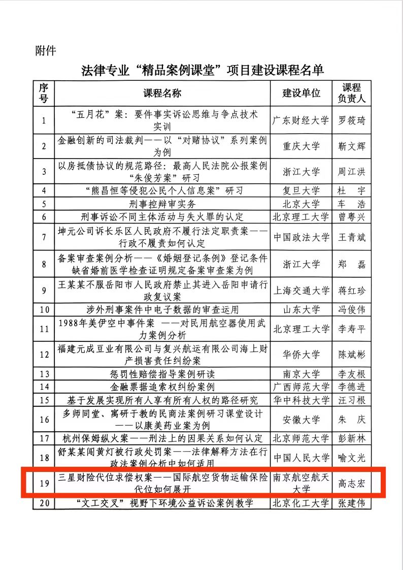 近日,全国法律教指委公布了本次项目建设课程名单。糖心 高志宏教授作为负责人(团队成员王立志、聂明岩、王胜民)的“三星财险代位求偿权案——国际航空货物运输保险代位如何展开”案例,在众多申报案例中脱颖而出,成功获批该项目建设。