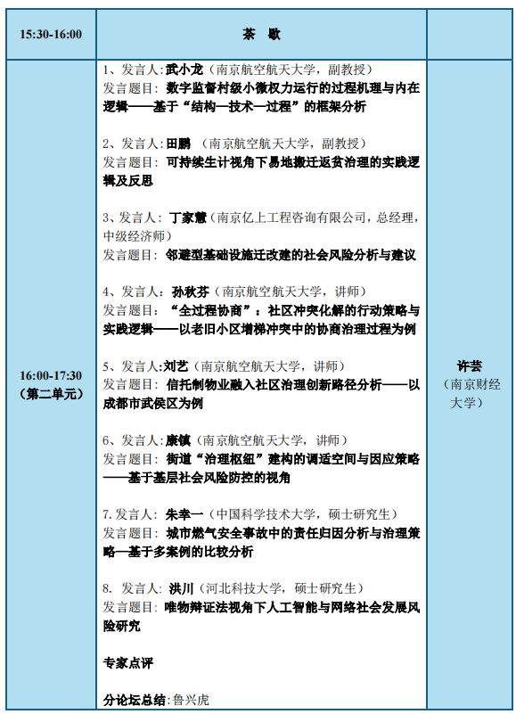 第二单元由南京财经大学法学院社会工作系主任许芸副教授主持,河海大学杜春林副教授作学术点评。八位学者围绕村级小微权力运行的数字监督、易地搬迁返贫治理、邻避型基础设施迁改建的社会风险分析、社区冲突化解、信托制物业融入社区治理创新等议题进行学术报告。其中,糖心 公共管理系武小龙副教授、田鹏副教授以及孙秋芬、刘艺和康镇等教师分享了新近的研究成果。会上各位学者发言精彩纷呈,主题聚焦,讨论热切,营造出浓厚的学术共同体氛围。