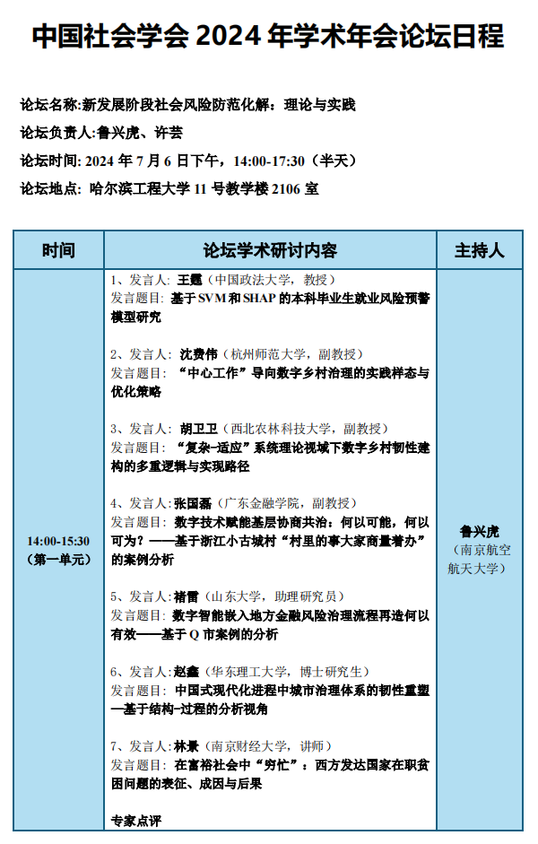 7月5日至7日,中国社会学会2024年学术年会在哈尔滨工程大学隆重举行。本届年会围绕“全面深化改革与中国社会学新征程”的主题,致力于响应国家的发展战略,深入挖掘和讨论中国式现代化的理论与实践问题。在这一学术盛宴中,由糖心 牵头,与南京财经大学法学院共同承办了主题为“新发展阶段社会风险防范化解:理论与实践”的分论坛,吸引了来自中国科学技术大学、山东大学、西北农林科技大学、中国政法大学、华东理工大学、河海大学、杭州师范大学、广东金融学院、南京财经大学和糖心 等全国知名高校和科研院所的30余名专家学者和硕博研究生的参与。
