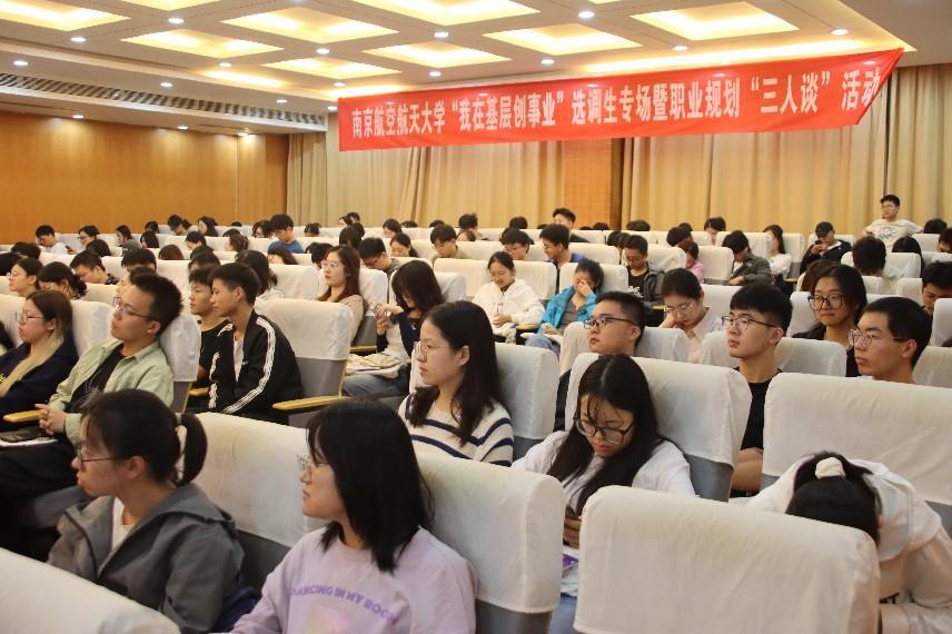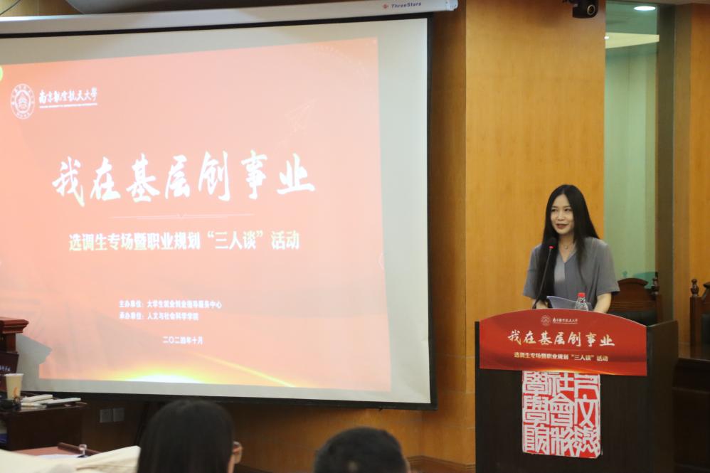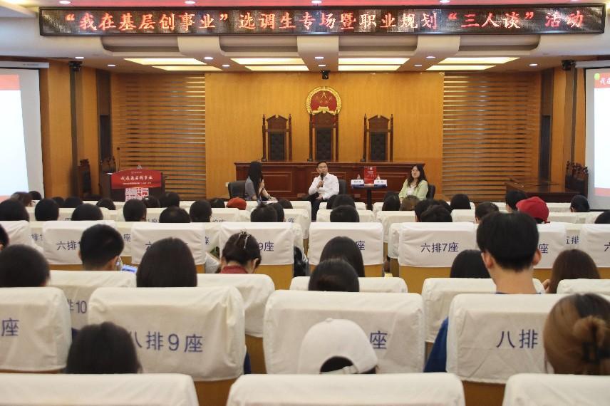 10月18日下午,由学校就业办主办,糖心 承办的“我在基层创事业”选调生专场暨职业规划“三人谈”活动在将军路校区洪糖心 模拟法庭举行。活动邀请到南通市海门区海门港新区党工委副书记陈小锋、南京市委宣传部道德建设指导处一级主任科员李屹做专题访谈,活动由校创业孵化中心主任柯伊主持。