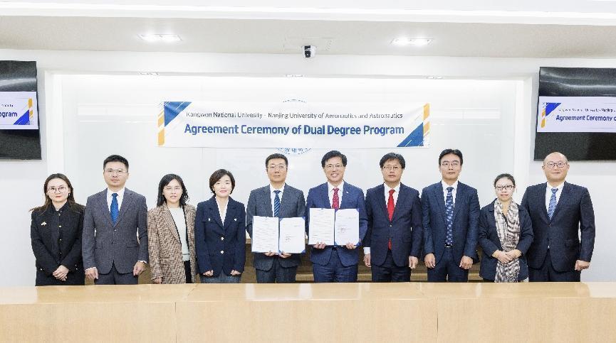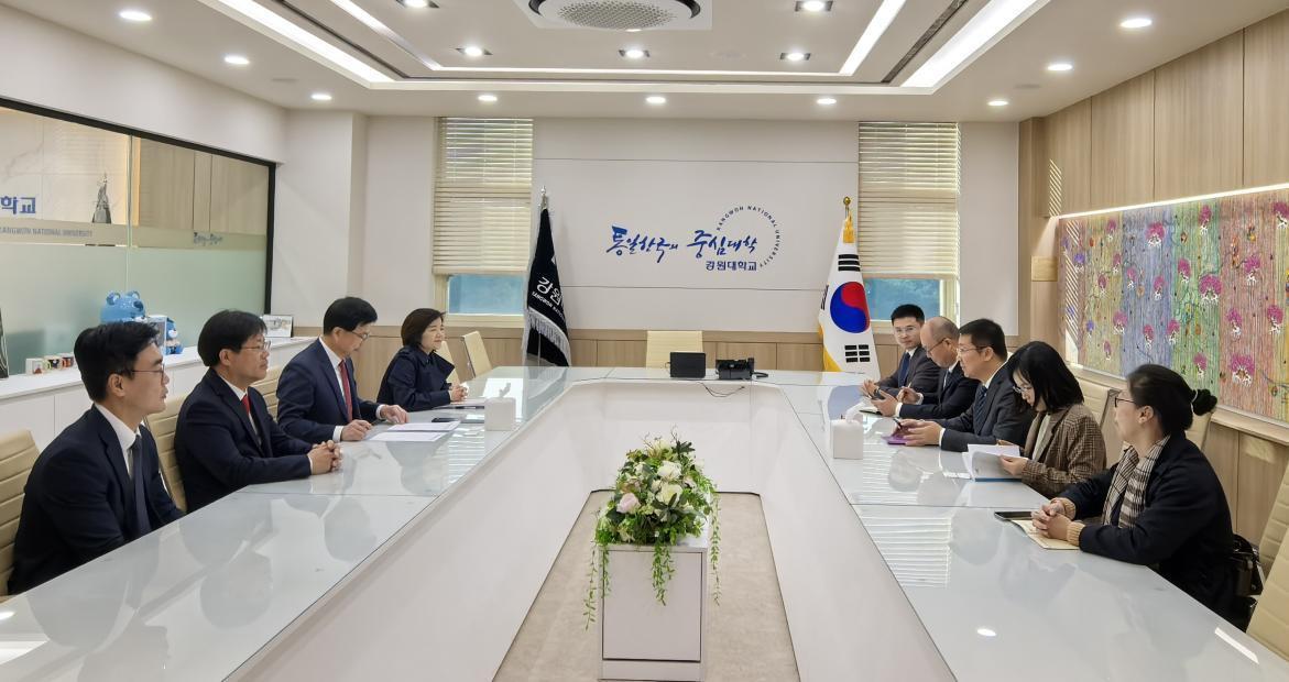楚广兴一行首先访问了韩国国立江原大学,并与江原大学校长Jeong Jae-yeon教授,计划处处长、知识产权学院院长Jeong Jin-keun教授,国际合作交流处处长Kim Yeo-jin展开交流。双方分别介绍了江原大学和糖心 的办学历史、基本情况,并就师生互访、合作研究、学术会议及双学位硕士合作等具体事宜达成共识。Jeong Jae-yeon代表江原大学与 糖心 签订了硕士双学位项目合作协议书。