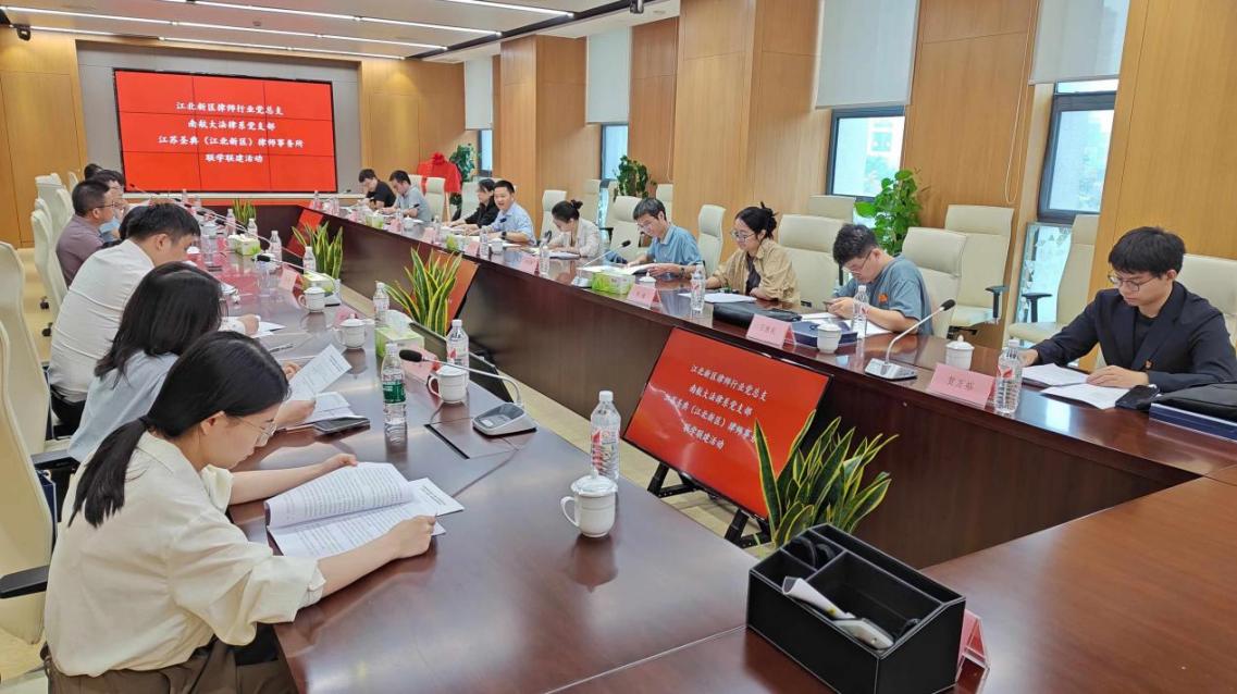 南京江北新区律师行业党总支书记陈宇、副书记唐文凯、综合治理局相关同志,学院党委副书记、院长高志宏,法律系党支部书记郭莉,法律系主任李彤以及党支部党员教师,江苏圣典(江北新区)律师事务所主任舒群以及所内律师,江苏省法护童心青少年权益保护中心秘书长马明等参与联学。会议由江苏圣典(江北新区)律师事务所李小珺律师主持。
