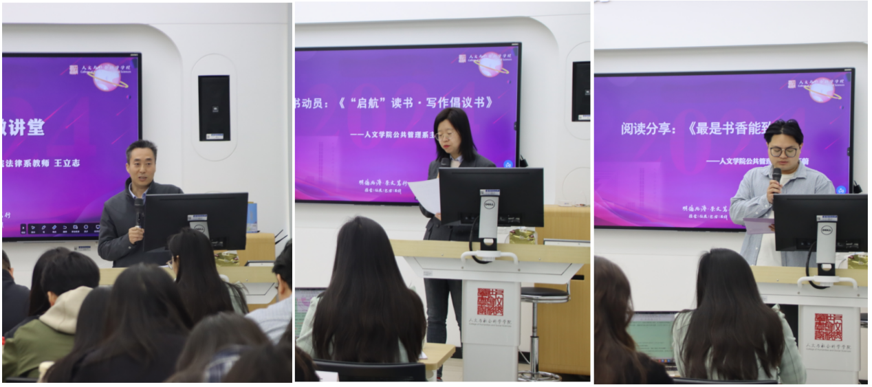 法律系王立志教授以《立身以立学为先,立学以读书为本》为题,分享了自己与书为伴的成长故事,讲述了经典书籍如何启迪智慧、塑造品格,帮助他一步步走向学术的殿堂;公共管理系主任王媛宣读《“启航”读书·写作倡议书》,提出“每日一读、每月一书、每季一分享”的倡议;公共管理系学生王蔚以《最是书香能致远》为题,分享个人阅读故事。