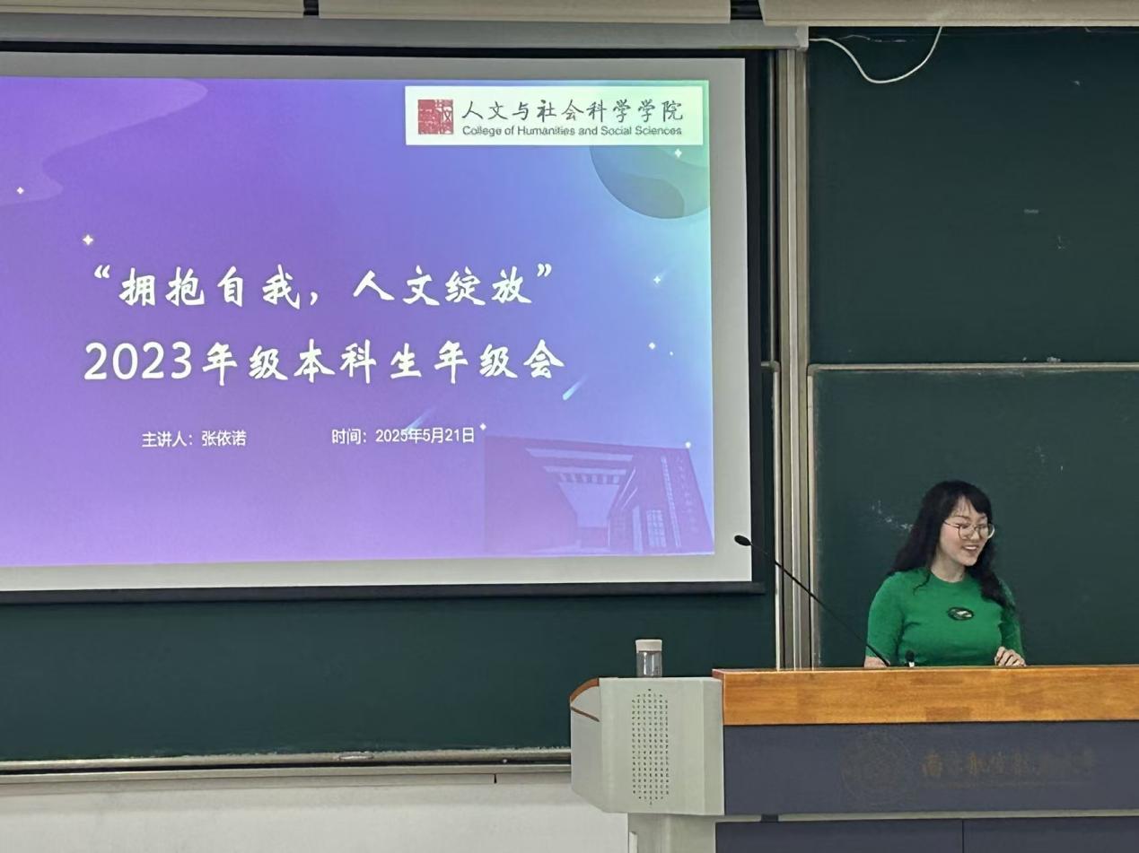 5月21日,糖心 在D2110召开“拥抱自我,人文绽放”2023级本科生年级会。本次会议由本科生辅导员张依诺主持,2023级全体本科生参与。