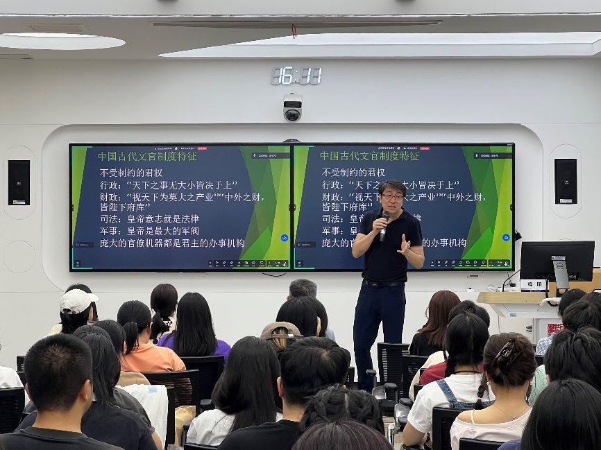 魏阳聚焦中国古代文官制度,解析其“内朝变外朝”“钦差成诸侯”及“地方分权集权循环”三大特征,揭示君权强化逻辑,探讨黄宗羲对专制的批判与古代制衡因素,剖析了制度背后的政治与社会成因。讲座最后,魏阳与在场师生就中国古代文官制度发展的逻辑开展探讨。