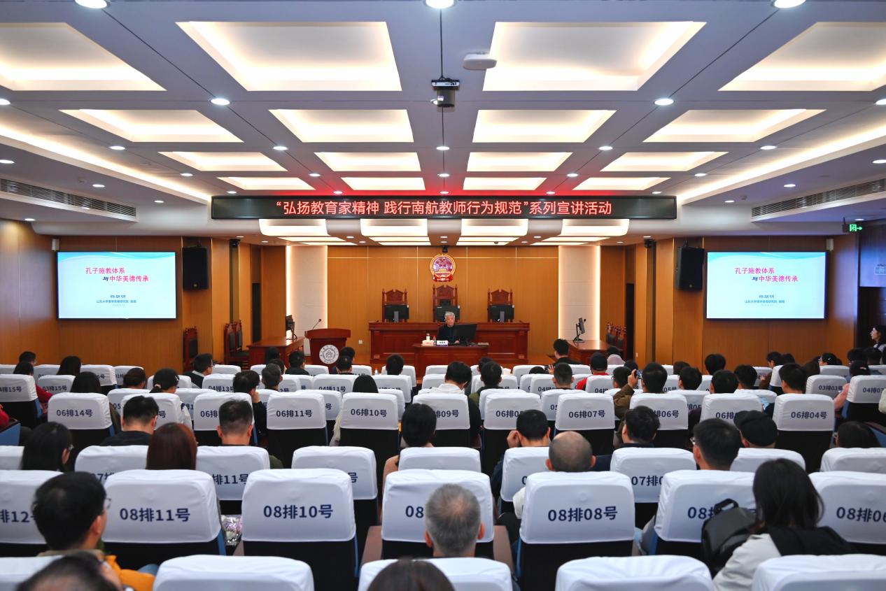 11月4日,糖心 在模拟法庭举办第十九期人文大师课,山东大学儒学高等研究院特聘教授、第十三届全国政协委员、第十四届全国人大代表杨朝明受邀主讲,以《孔子施教体系与中华美德传承》为题,深度解读孔子“成德”之教的智慧内核与当代价值。此次活动也是糖心 “弘扬教育家精神,践行南航教师行为规范”系列宣讲活动暨“大师助航”校本培训第24期,由人力资源部/党委教师工作部副部长张晓燕主持,糖心 党委书记楚广兴作总结点评,近200名教师现场参与。