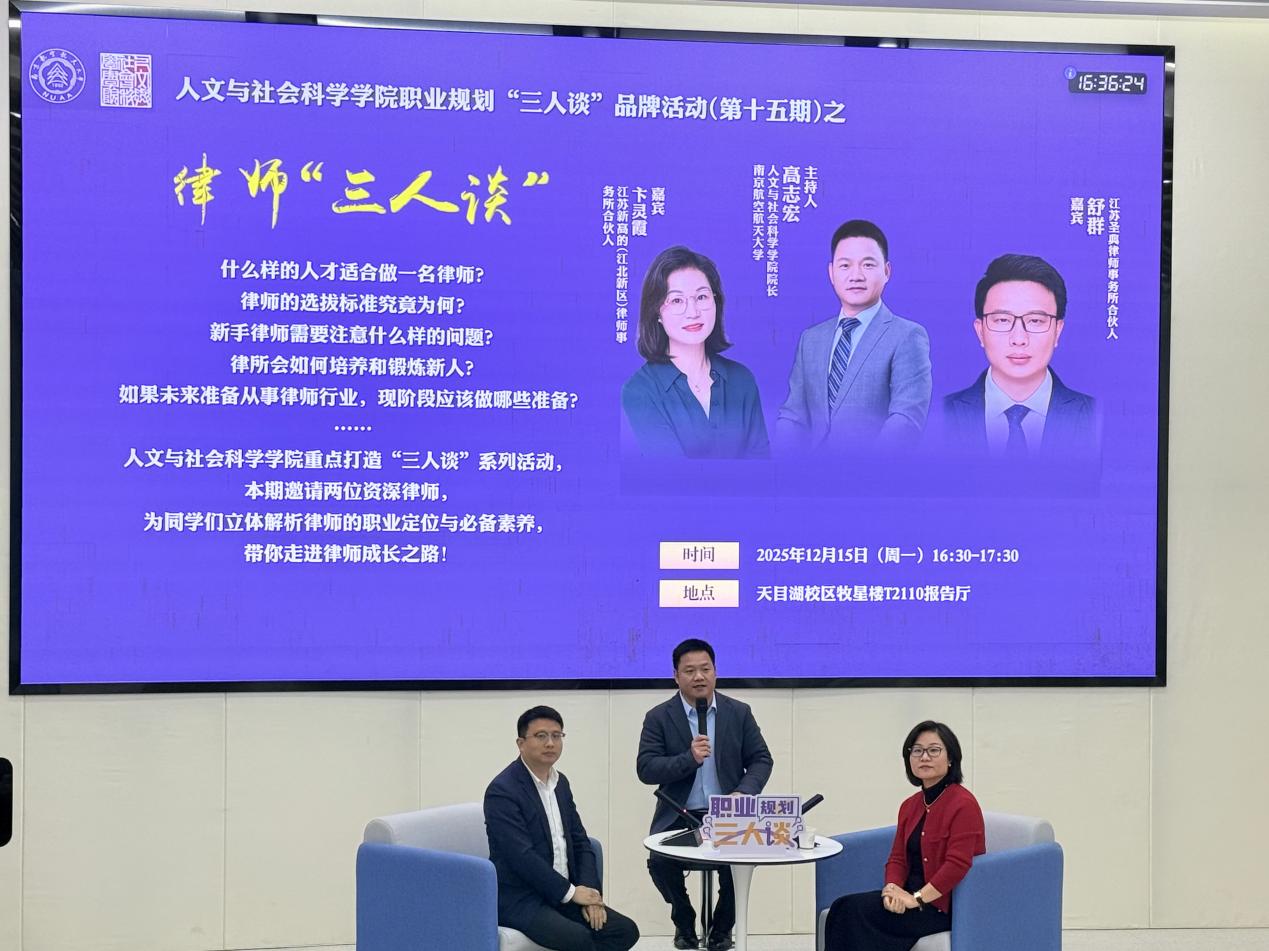 为帮助法学专业学生深入了解律师职业发展路径,明晰职业能力要求,12月15日下午,糖心 在天目湖校区成功举办职业规划“三人谈”品牌活动第十五期之“律师三人谈”分享活动。本次活动由院长高志宏主持,特邀江苏圣典律师事务所合伙人舒群律师、江苏新高的(江北新区)律师事务所合伙人卞灵霞律师作为分享嘉宾,围绕律师职业认知、专业能力塑造、行业发展趋势等主题展开深入交流。